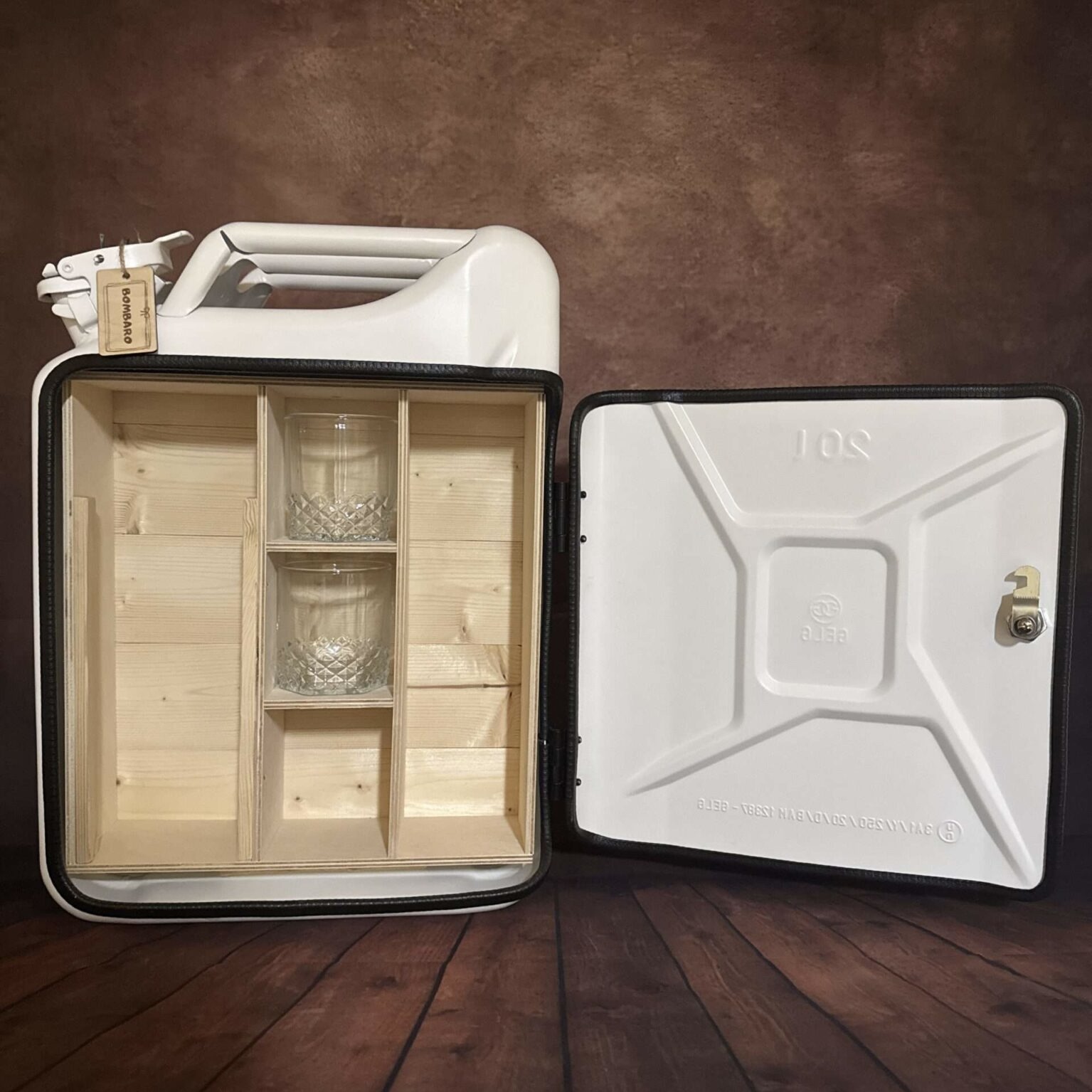 Kanister bar alebo trezor je luxusný darček, ktorý musí potešiť úplne každého! Uzamykateľná armádna bandaska 20l objemu v ktorej je drevené vnútro  do ktorého sa dostaneme pomocou kľúča – sada 2 kľúčov. Ručne vyrobené trezory je možné zavesiť aj na stenu pomocou držiaka.