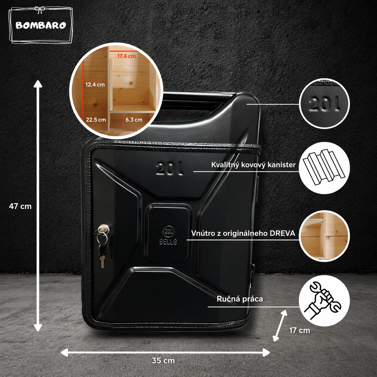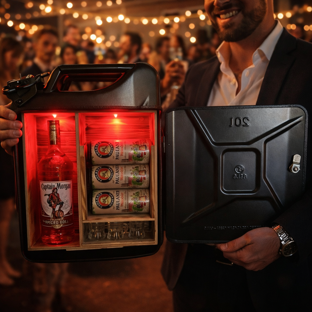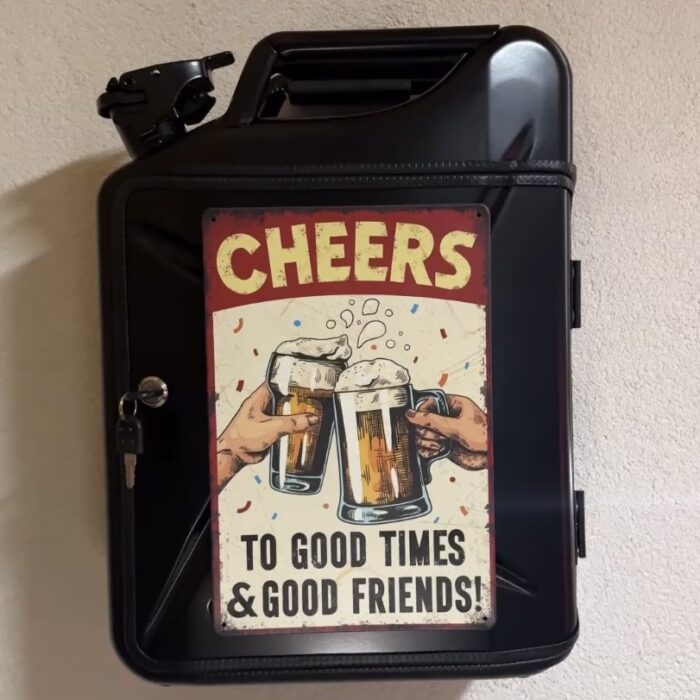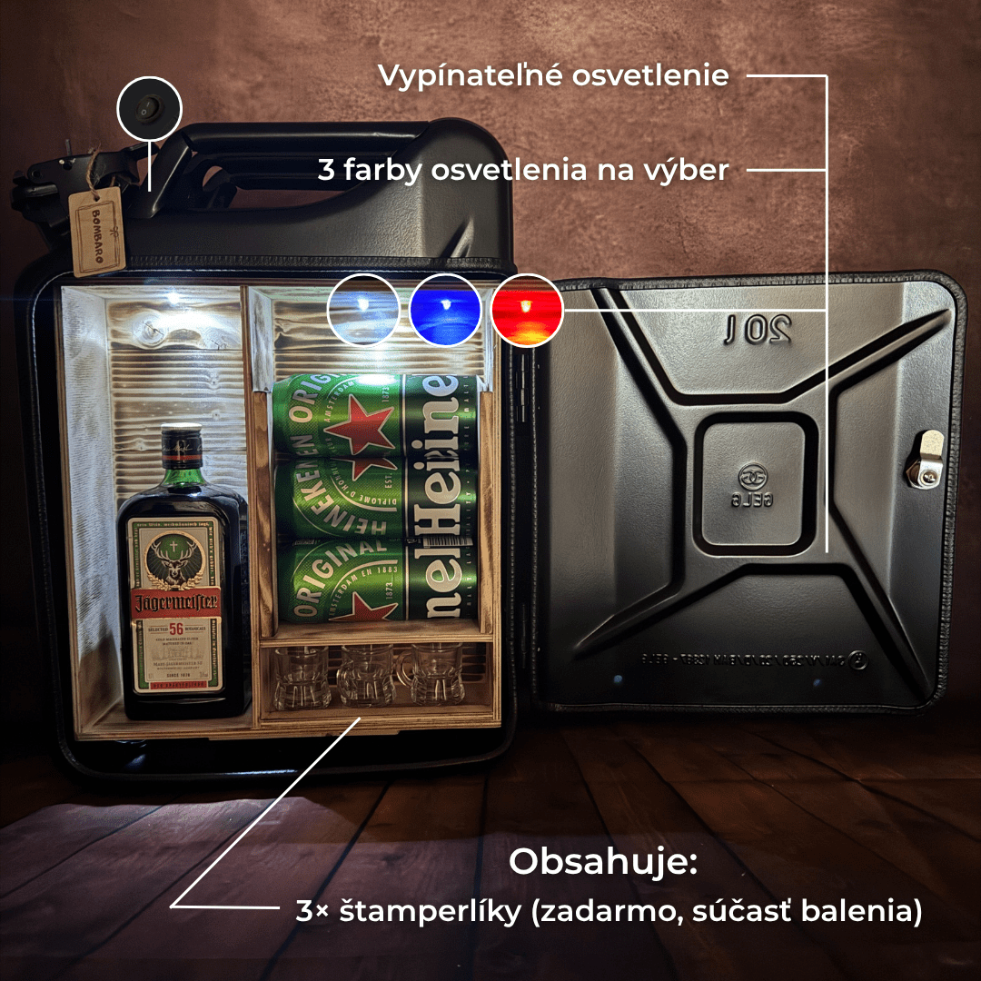Kanister bar alebo trezor je luxusný darček, ktorý musí potešiť úplne každého! Uzamykateľná armádna bandaska 20l objemu v ktorej je drevené vnútro  do ktorého sa dostaneme pomocou kľúča – sada 2 kľúčov. Ručne vyrobené trezory je možné zavesiť aj na stenu pomocou držiaka.